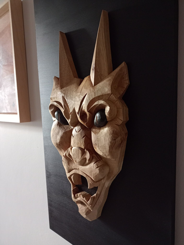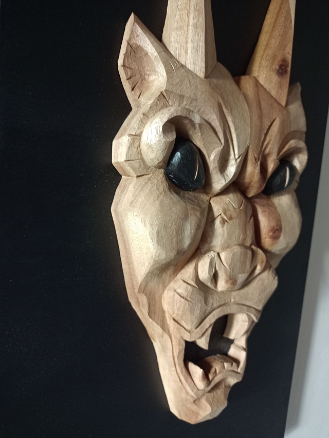 Matériau : bois d'acacia sculpté et protégé par une huile mat incolore; vissé sur une planche en contreplaqué peinte en noire.