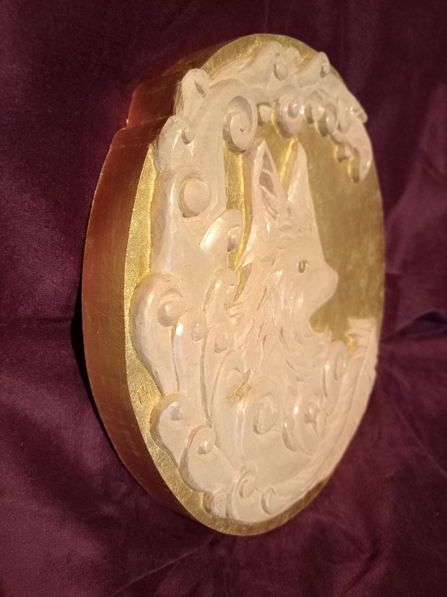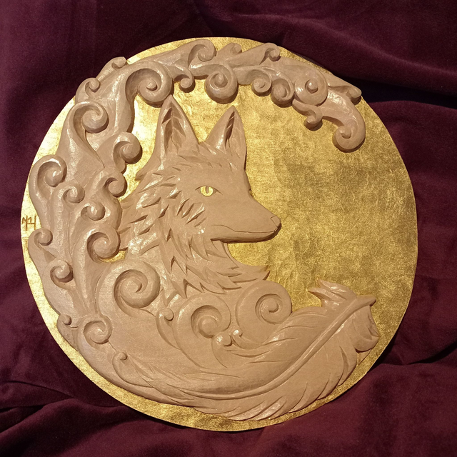 Le Renard d'Or en tilleul, animal symbole de ruse et d’intelligence est un portrait de renard de profil, accompagné de volutes et d'une plume.