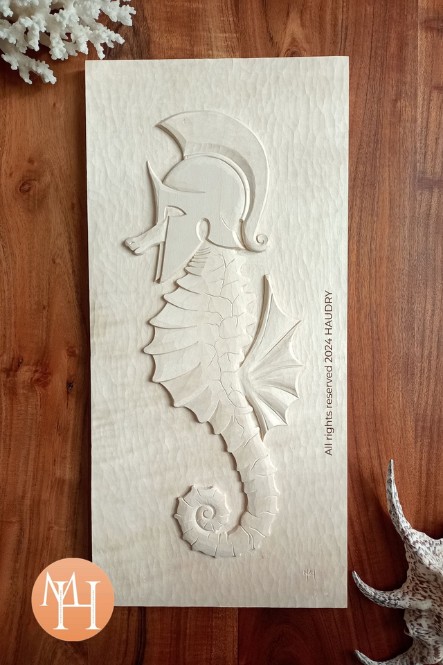 Spartacus est un bas-relief représentant un hippocampe majestueux coiffé d'un casque spartiate. Le fond du bas-relief, gougé à la main, offre un rendu unique et changeant avec la lumière faisant penser aux miroitements de l’eau.